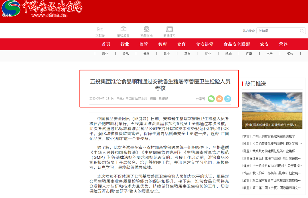 《中国食品安全网》关注:淮浍食品顺利通过安徽省生猪屠宰兽医卫生检验人员考核