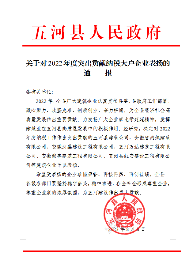 近日,五河县人民政府通报表彰了县多家纳税企业,太阳成集团tyc33455集团虹安建设公司获“2022年度突出贡献纳税大户”称号。这既是对虹安建设公司诚信经营良好风气的表彰,也是对其为五河经济建设发展作出贡献的肯定,更是展现了虹安建设公司对外的良好形象。