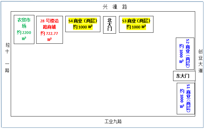 商业房共4处,以整体打包拍租或每处为一个标的分别拍租的方式(具体标的信息以拍租公告为准),适用业态主要包括餐饮、商超、办公、教育培训等。农贸市场(综合生活购物中心)一座。标的1:农贸市场;标的2:28号楼商铺;标的3:S3S4商业;标的4:S1S2商业。