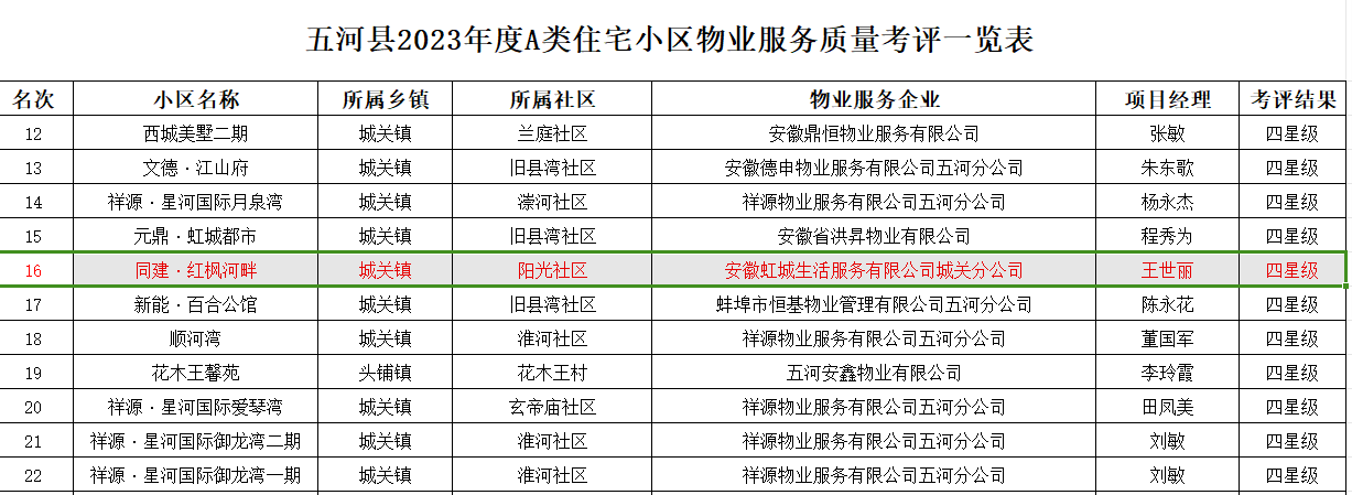 近日,蚌埠市三县六区所辖区内住宅小区物业服务质量考评结果出炉。安徽虹城生活服务有限公司同建·红枫河畔项目在“2023年度A类住宅小区物业服务质量考评”中综合评定为四星级。