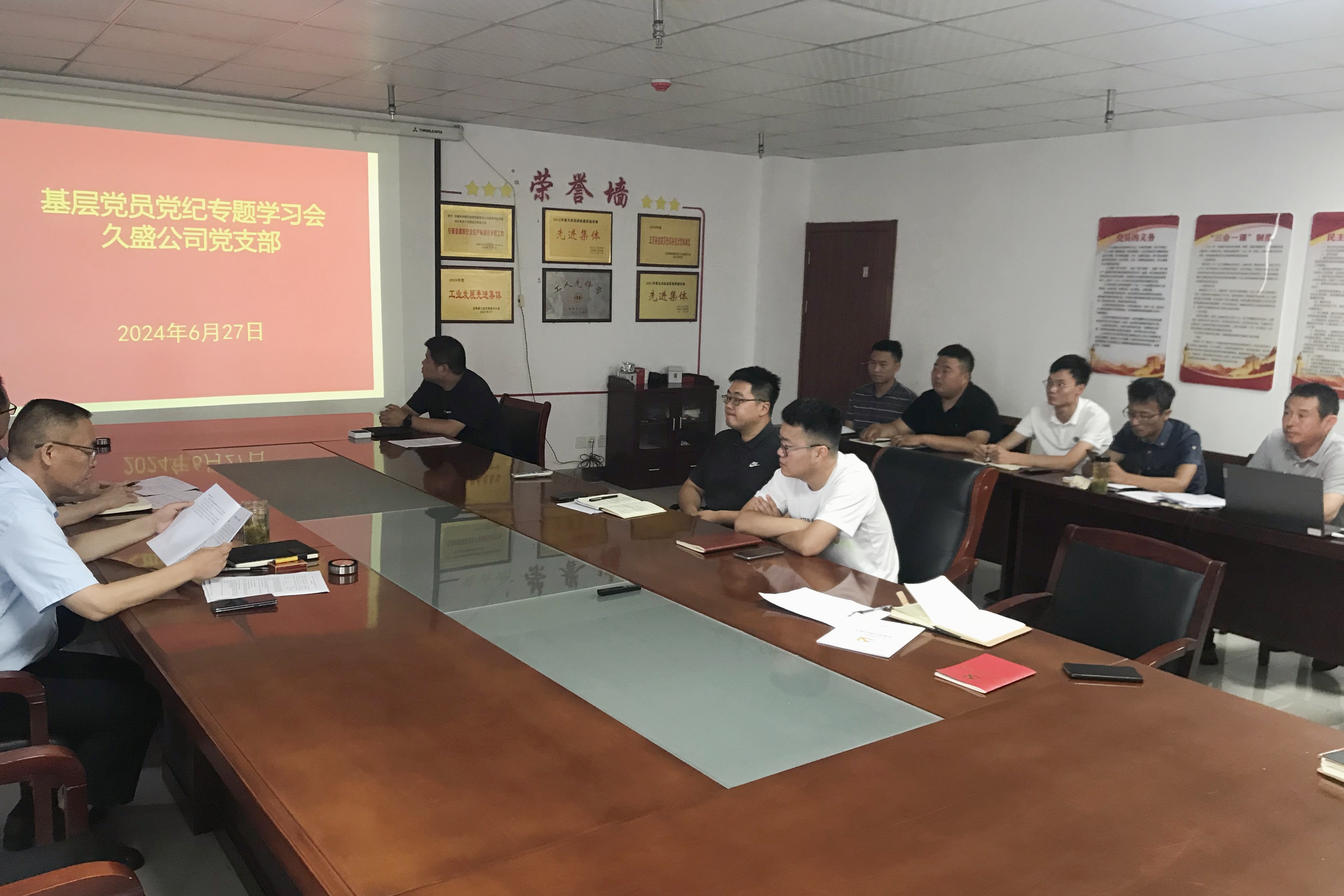 久盛党支部书记王超同志以《筑牢思想防线,守住纪律底线》为课题,通过解读党纪学习教育读本,引领全体党员干部要保持政治定力,提高政治站位,忠诚履职担当,筑牢思想防线,守住纪律底线,推动公司高质量发展。