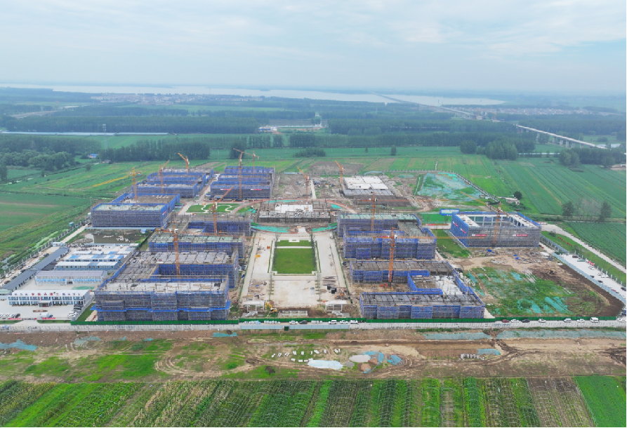 五河县职教园区二期工程项目计划工期500个日历天,总建筑面积约149937.04㎡,其中,地上建筑面积约为141374.47㎡,地下建筑面积约为8562.57㎡,主要建设内容包括综合楼、教学实训楼、学生宿舍、报告厅、图书馆、体育中心、实训厂房、餐厅、种植专业实训基地等。目前,宿舍楼A栋主体结构施工完成,正在进行墙体砌筑;宿舍楼B栋外粉及防水施工完成;体育中心、教学实训楼A、B栋基础结构施工完成;实训厂房A、B、C栋基础结构施工中;其余楼栋正在进行土方开挖作业。