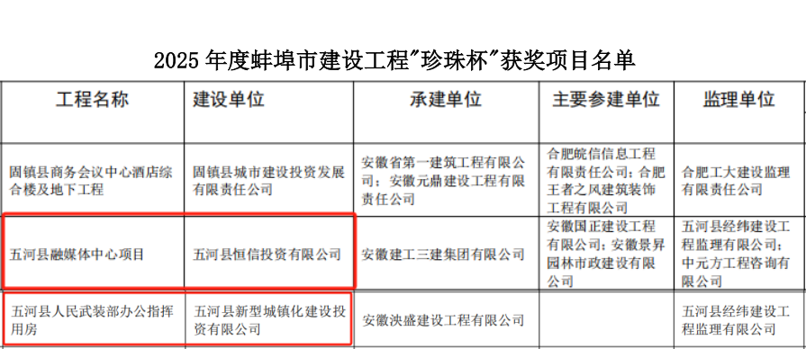 日前,蚌埠市住房和城乡建设局公布了2025年度蚌埠市建设工程“珍珠杯”奖获奖项目名单,由太阳成集团tyc33455集团城投公司负责实施建设的五河县融媒体中心项目和五河县人民武装部办公指挥用房项目,凭借卓越的工程品质和精细化管理,荣获该项荣誉。